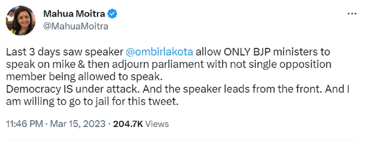 महुआ मोइत्रा ने एक ट्वीट कर लोकसभा स्पीकर ओम बिरला पर माइक बंद करने का आरोप लगाया है। उन्होंने ट्वीट कर कहा, "बीते तीन दिनों के दौरान स्पीकर ओम बिरला ने सिर्फ भाजपा सांसदों को ही माइक पर बोलने की अनुमति दी और उसके बाद सदन को स्थगित कर दिया। विपक्ष के एक भी सांसद को बोलने नहीं दिया गया। लोकतंत्र खतरे में है।" टीएमसी सांसद ने आगे कहा कि मैं इस ट्वीट के लिए जेल जाने के लिए भी तैयार हूं।